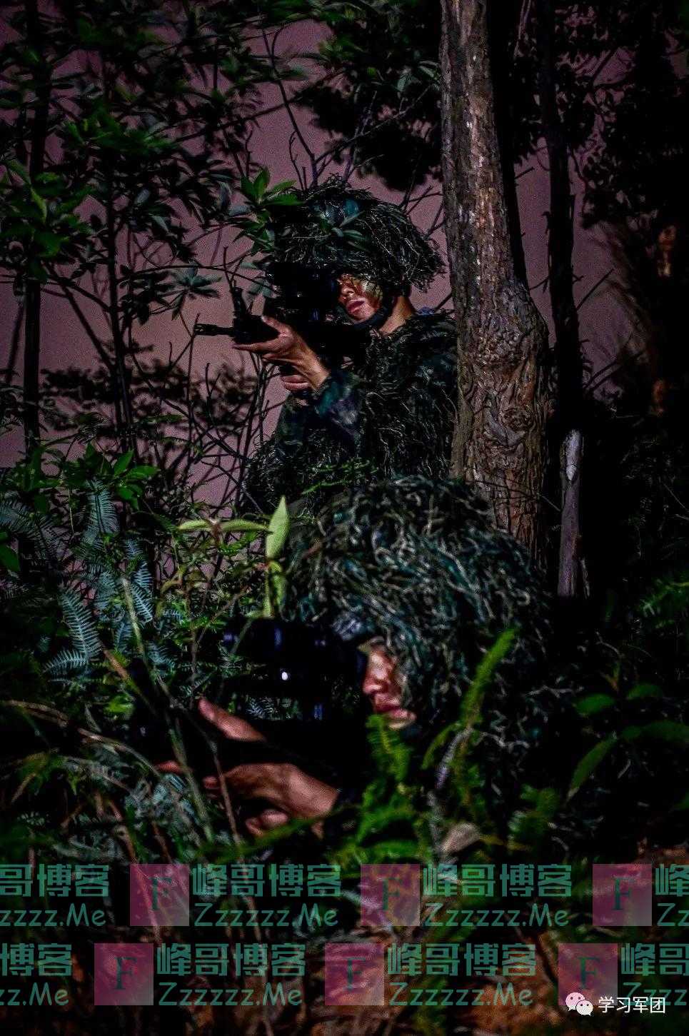 丛林深处,侦察队员着伪装服前出侦察。