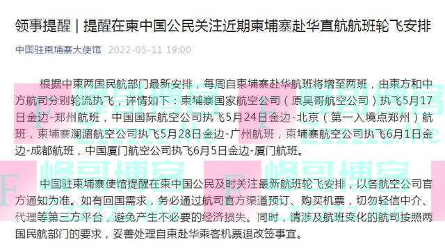 据中国驻柬埔寨大使馆微信公众号消息,根据中柬两国民航部门最新安排,每周自柬埔寨赴华航班将增至两班,由柬方和中方航司分别轮流执飞,详情如下:柬埔寨国家航空公司(原吴哥航空公司)执飞5月17日金边-郑州航班,中国国际航空公司执飞5月24日金边-北京(第一入境点郑州)航班,柬埔寨澜湄航空公司执飞5月28日金边-广州航班,柬埔寨航空公司执飞6月1日金边-成都航班,中国厦门航空公司执飞6月5日金边-厦门航班。