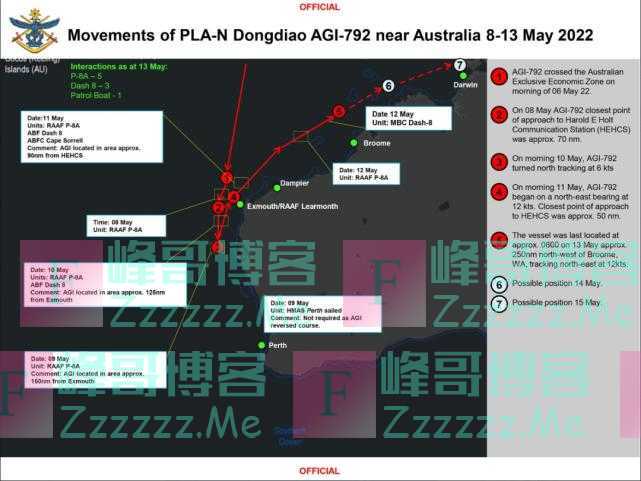 澳国防部同日发声明称,一艘“海王星”号中国海军情报搜集船出现在澳西北大陆架附近,沿着澳西海岸行驶,到达埃克斯茅斯附近,然后改变航向,沿西北海岸向东行驶。《悉尼先驱晨报》13日引述达顿的话报道称,这是中国海军舰艇在澳西海岸向南航行所能到达的最远距离,“这很不寻常,我们从未见过解放军的舰艇向南这么远。”但报道也指出,该船一直在国际水域,在澳专属经济区。澳国防部表示,澳正利用海空力量监控该船,澳方尊重各国在国际海空行使航行和飞越自由的权利,也希望各国尊重澳方行使航行和飞越自由的权利。