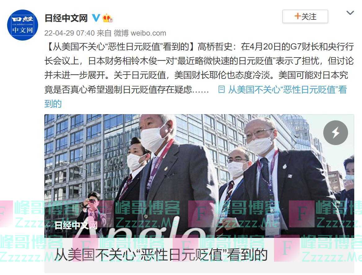 3月以来,日元对美元汇率已下跌近15%。“日元出逃”导致的恶性贬值让日本财务相铃木俊一在4月20日的七国集团(G7)财长和央行行长会议中,对美国财政部部长耶伦说“最近的日元贬值很迅速”,这一说法很符合日式的语言风格,但耶伦态度冷淡并没接话茬,此举被日媒以一篇“美国不关心恶性日元贬值”刊登在《日本经济新闻》上。