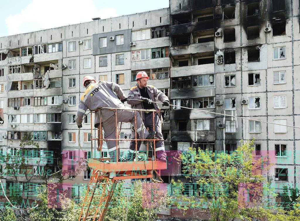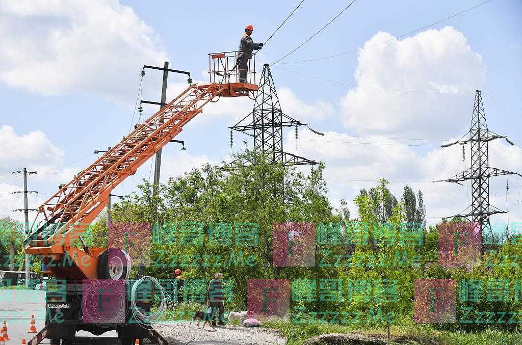 当地时间2022年5月16日,顿涅茨克马里乌波尔,工人重建输电线。