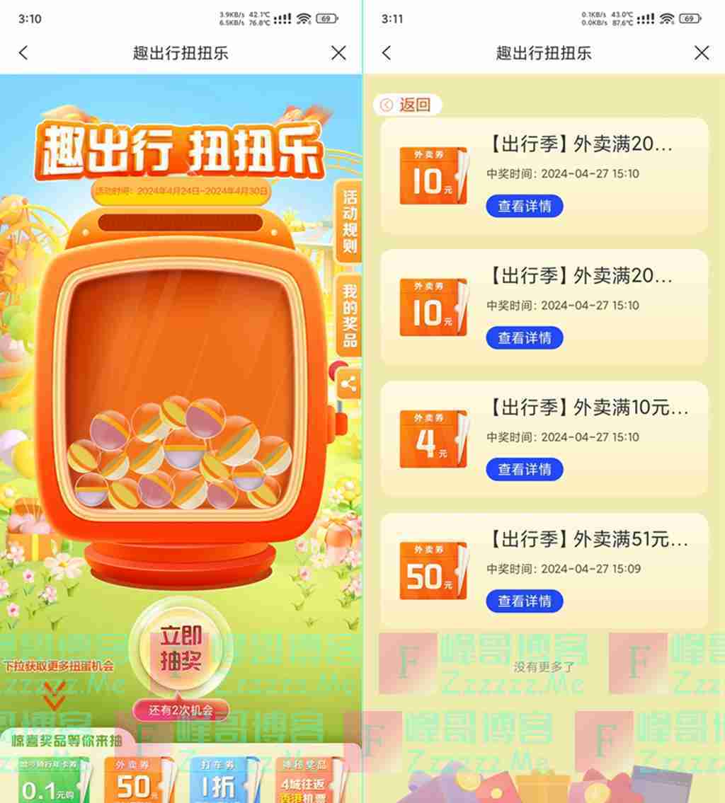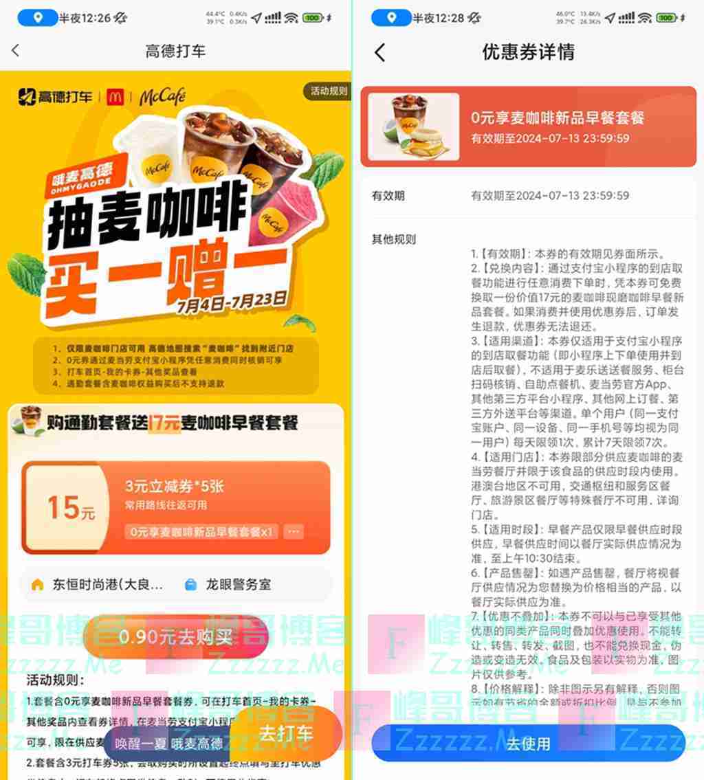 高德地图App活动,0.9元购买打车通勤套餐送一张麦当劳早餐券(任意消费可用)。...