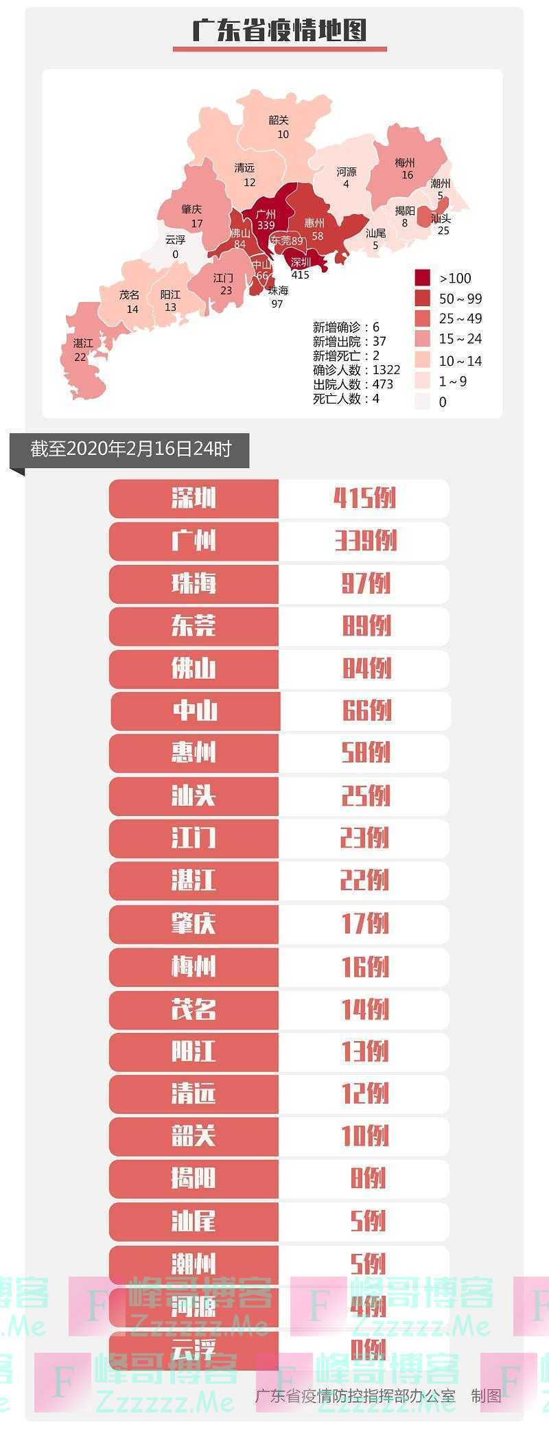 截至2月16日24时,全省累计报告新冠肺炎确诊病例1322例。16日当天全省新增确诊病例6例,新增出院37例,累计出院4...