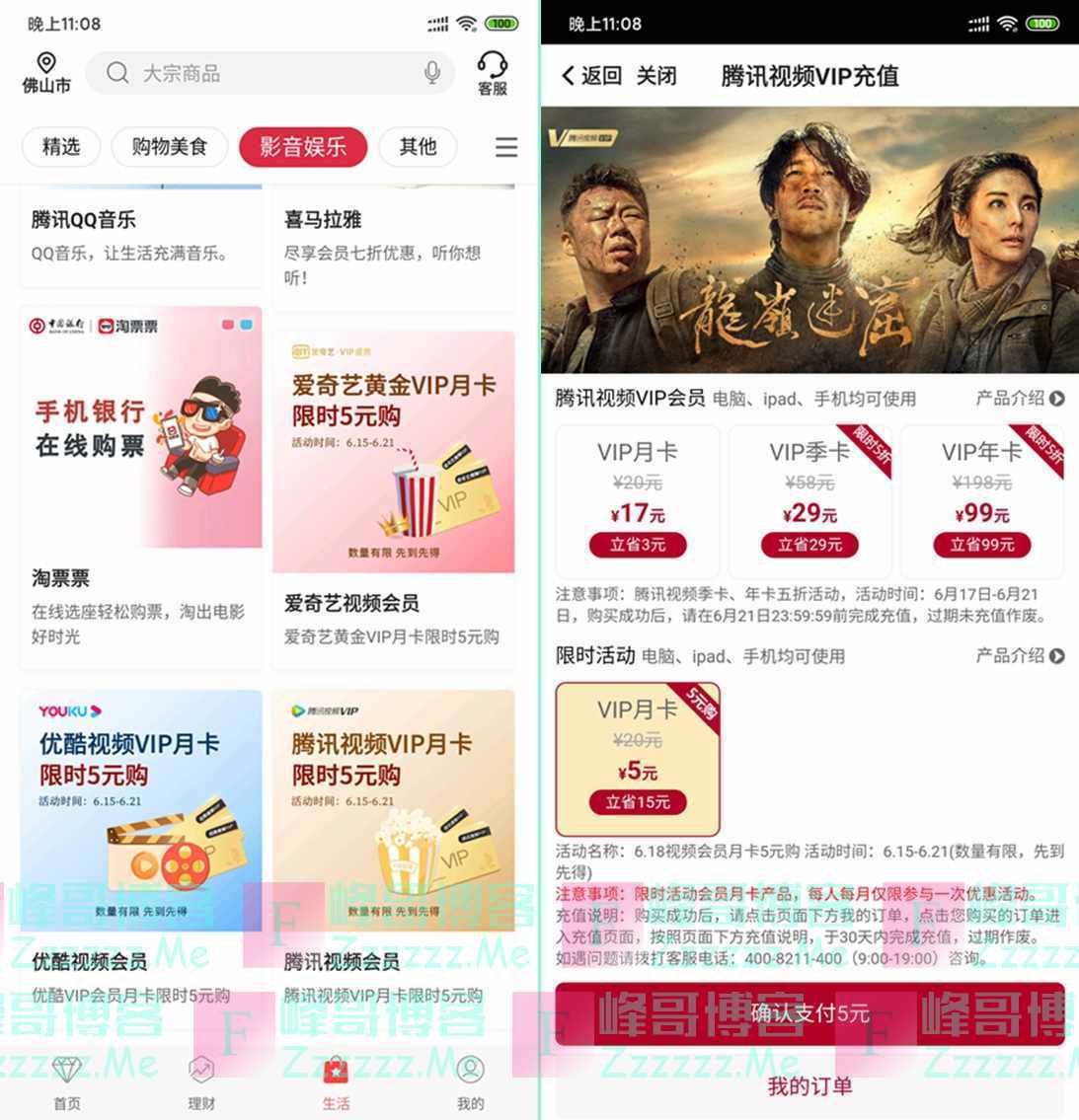 中国银行618视频会员五元购活动 5元充值腾讯视频VIP,爱奇艺VIP,优酷视频VIP
