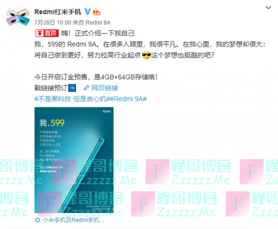 7月28日上午,Redmi9A正式发布,采用6.53英寸水滴屏,通过德国莱茵低蓝光认证,搭配3D曲面机...