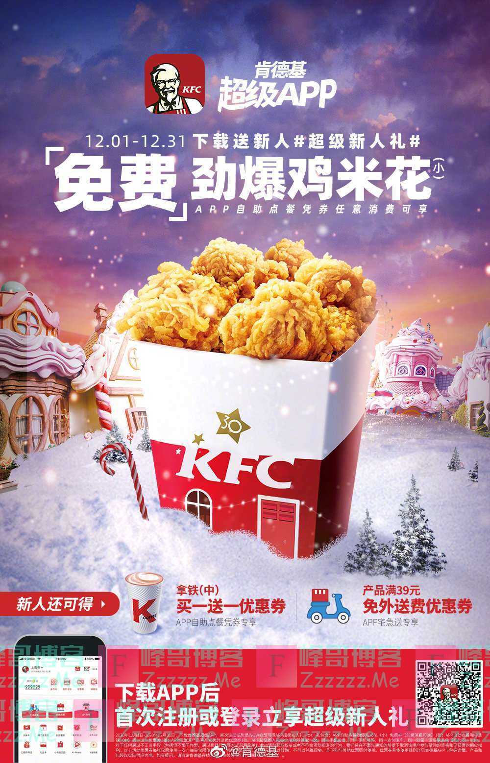肯德基APP新注册用户免费领小鸡米花一份,需要任意消费后到卡包选择优惠券使用!活...