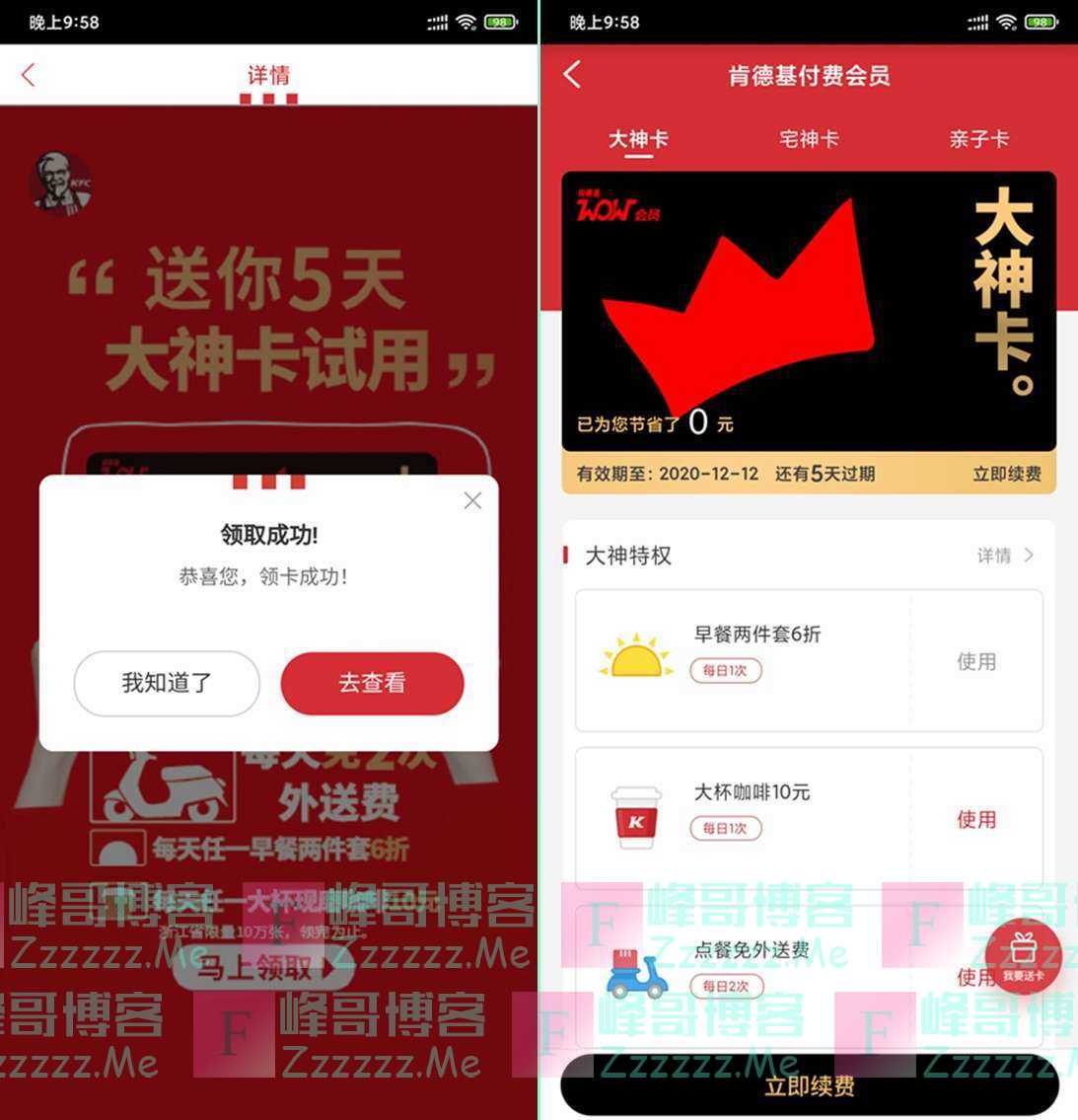 肯德基大神卡试用活动,不限新老用户免费领5天大神卡特权!进入活动页面后使用手机号...