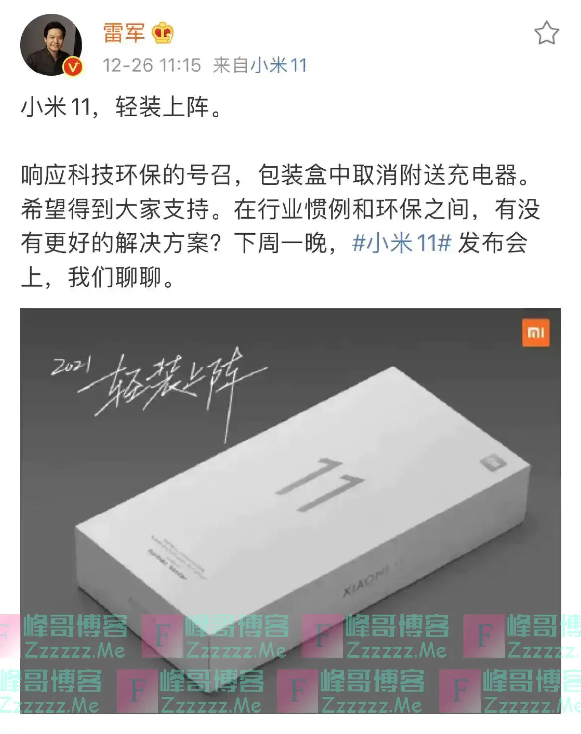 新京报贝壳财经讯(记者许诺)11月26日,小米创始人、董事长兼CEO雷军在微博上表示,“小米11,轻装上阵。响应科技环...